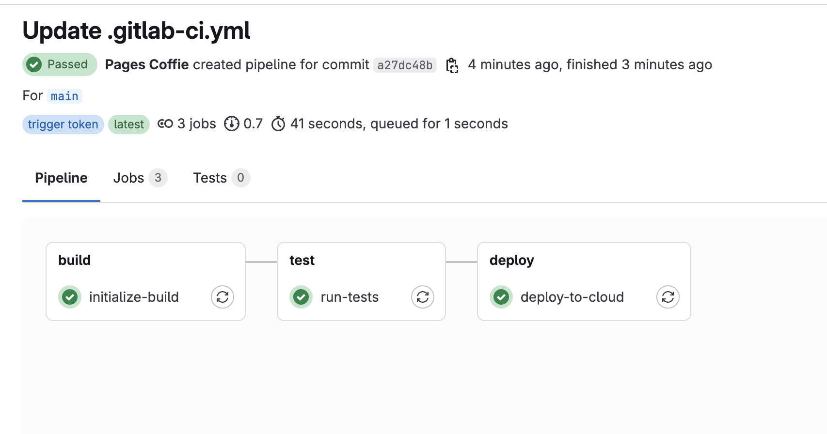 4. A GitLab pipeline will be triggered but will fail on the test stage due to not meeting coverage threshold